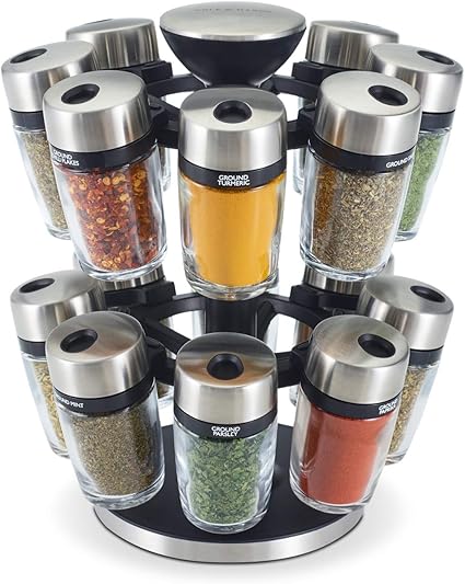This set includes a 16 piece revolving herb & spice rack and jars.