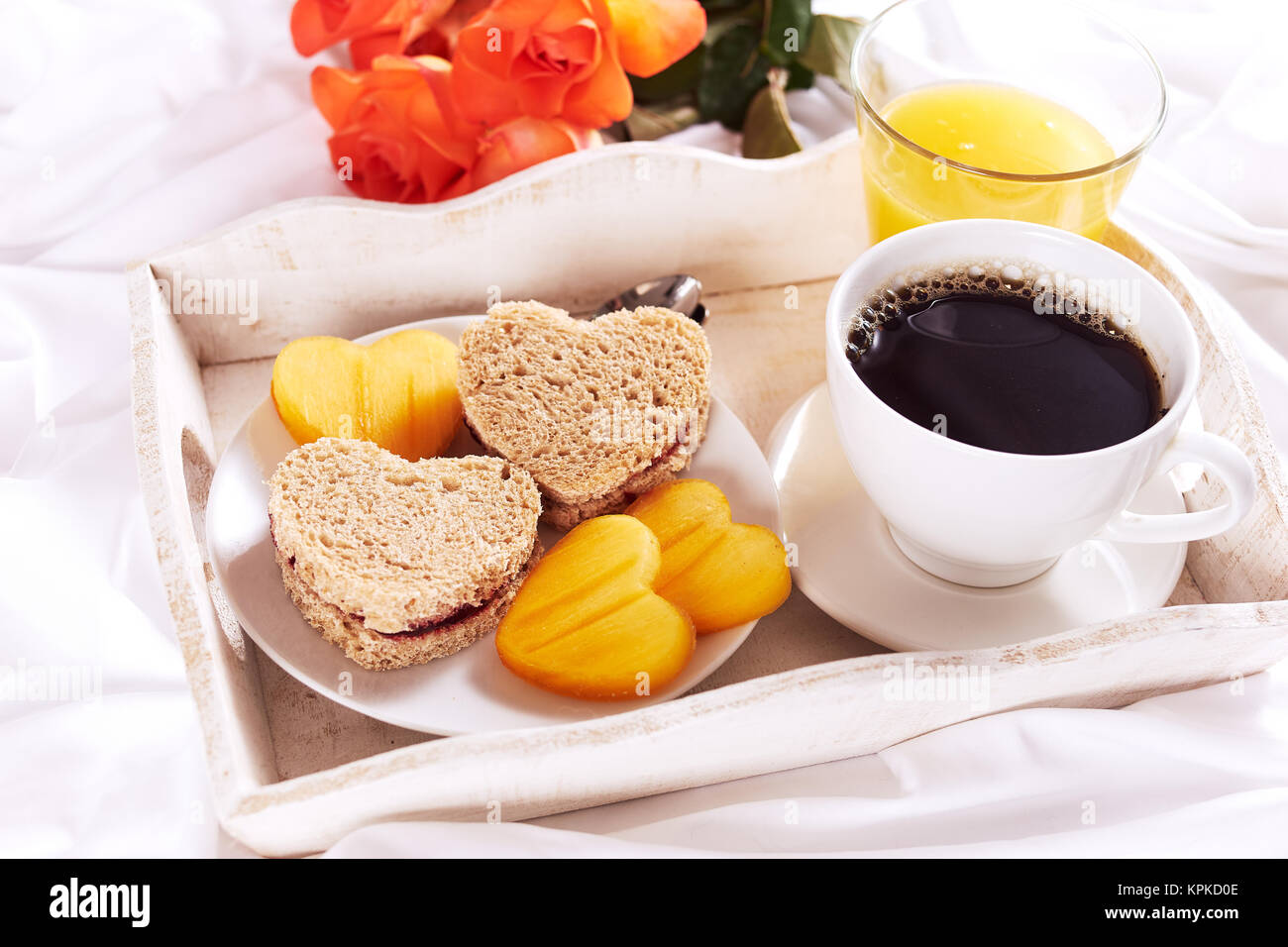 Saint Valentin Romantique Petit Dejeuner Au Lit Plateau Avec Croissant Tasse De Cafe Espresso Avec Du Lait Les Oranges Fraiches Verre D Eau Avec Du Citron Et Rose Rouge Photo Stock Alamy from c8.alamy.com
